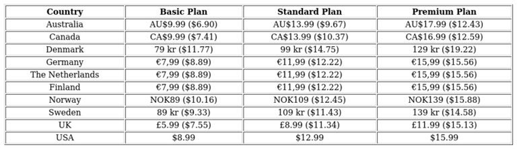 Looking at regional differences, Australia’s prices are comparatively lower, with the basic plan costing $6.90 and the premium just over $12.43. However, due to its later entry into the streaming market (2015), its price increases have been less steep—less than 17 percent on the standard plan.