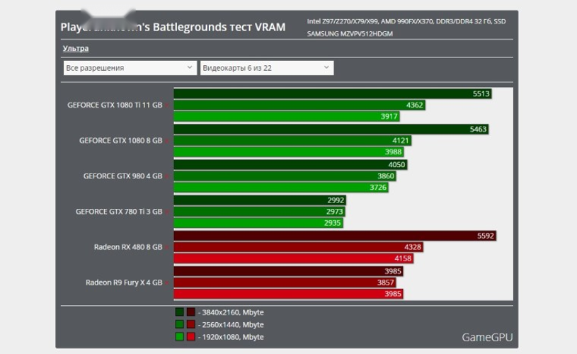 При игре в Playerunknown's Battlegrounds при разрешении 1920x1080 объем видеопамяти, используемый видеокартами с разным объемом встроенной памяти, показывает следующую картину: карты с 3 ГБ требуют около 3000 МБ, модели с 4 ГБ — примерно 3700 МБ, а видеокарты с 6 ГБ и больше используют около 4000 МБ. Варианты с 8 ГБ и 11 ГБ памяти показывают одинаковое потребление — 4000 МБ.