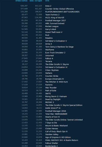 В рейтинге также присутствуют новые и популярные проекты: ролевая игра The Surge стартовала с четвертой строки, приключенческий экшн Prey опустился на пятое место. Дополнение Mass Transit к симулятору городского строительства Cities: Skylines занимает шестую позицию, а культовая GTA V продолжает удерживаться на седьмом месте. На восьмой строке — bundle Alan Wake со скидкой в 90%, который вскоре будет удален из сервиса. Мультиплеерный шутер H1Z1: King of the Kill снизился до девятой позиции, а японский экшн Dragon Ball Xenoverse 2 завершает десятку самых популярных игр недели.
