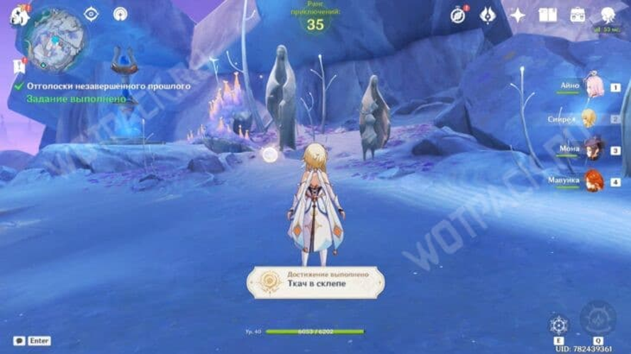 Auf der nächsten Ebene begegnen die Reisenden, Paimon und die Priesterin einer geisterhaften Projektion. Es ist Frau Ayla, die ursprüngliche Stimme der Mondhymne, die das Team einst am Thunderclap Reef anführte und sie auf ihrem Weg begleitet.